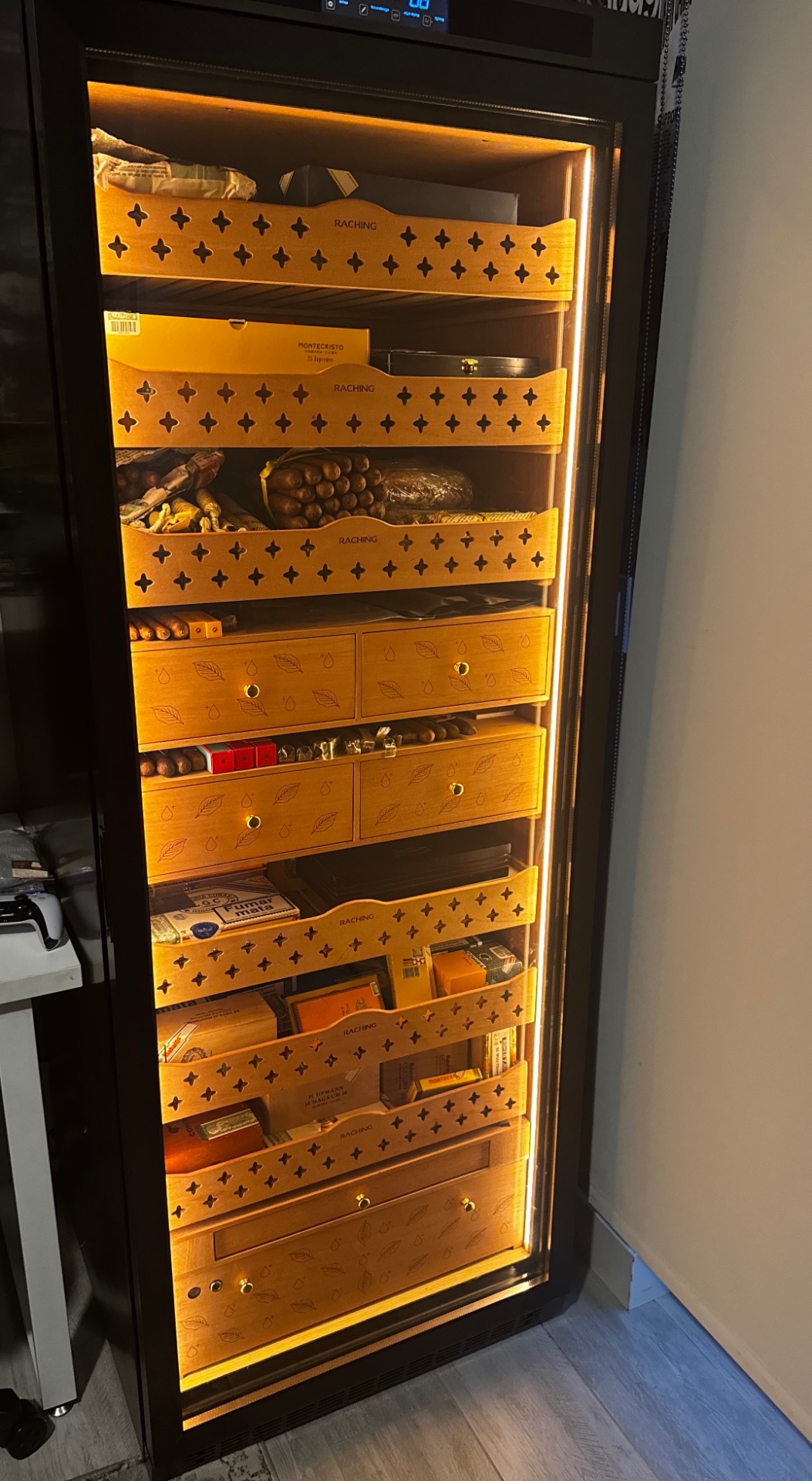 Capacity & layout: Raching is the bigger box (≈580 L; ~3,000–4,000 cigars) with more room and nicer drawer/shelf organization. Yohtron is ~448 L (~2,300 cigars).